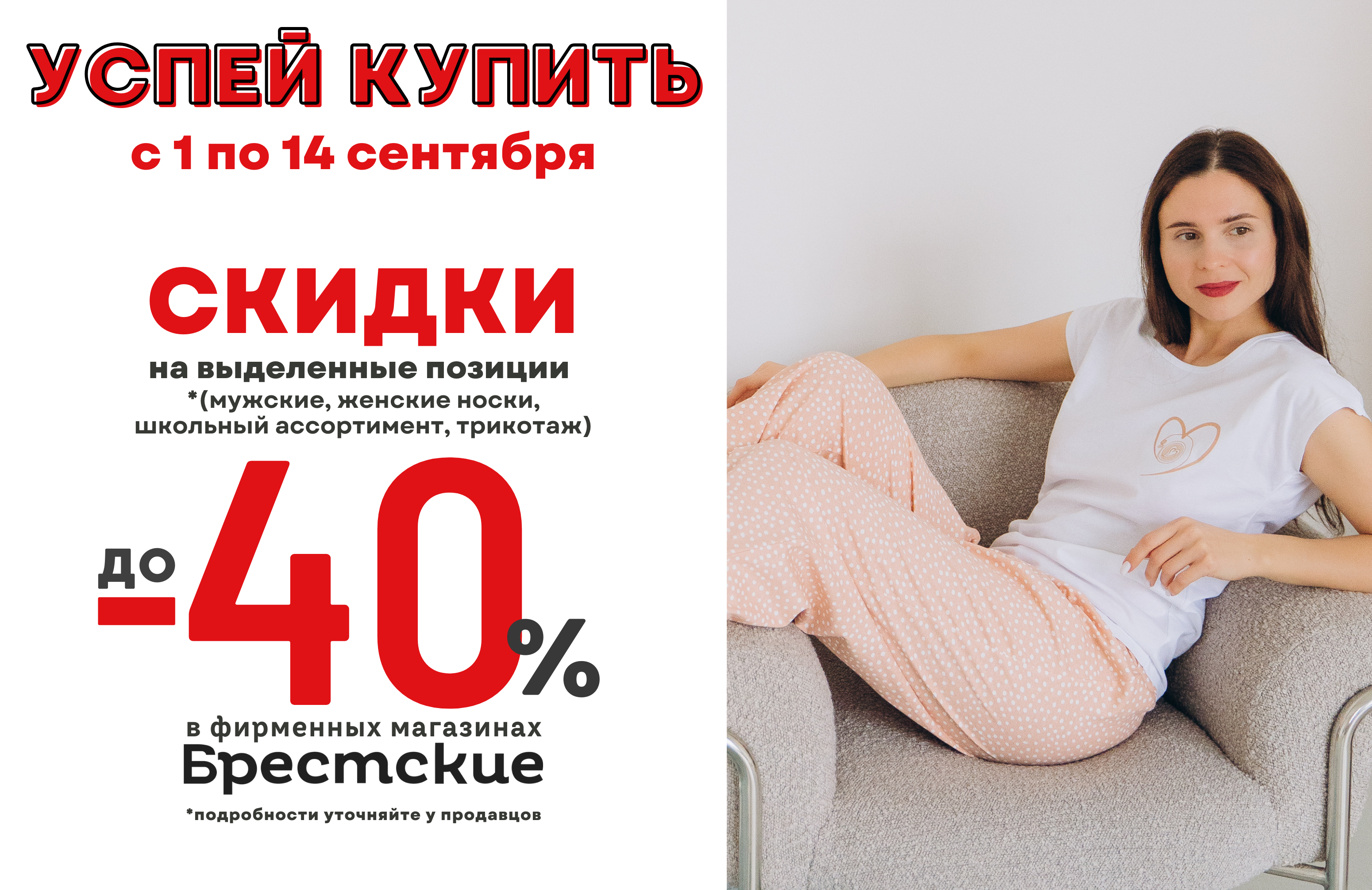 Скидки до 40% на выделенный ассортимент* (мужские и женские носки, школьный ассортимент, трикотаж и пижама.)