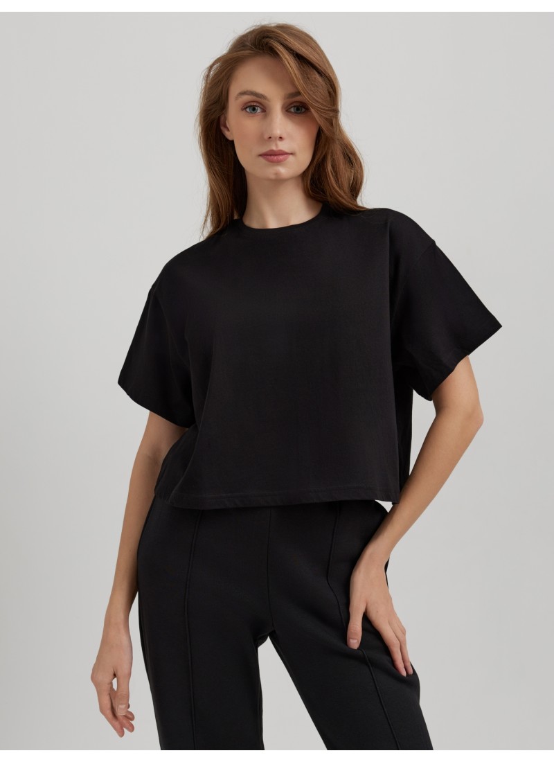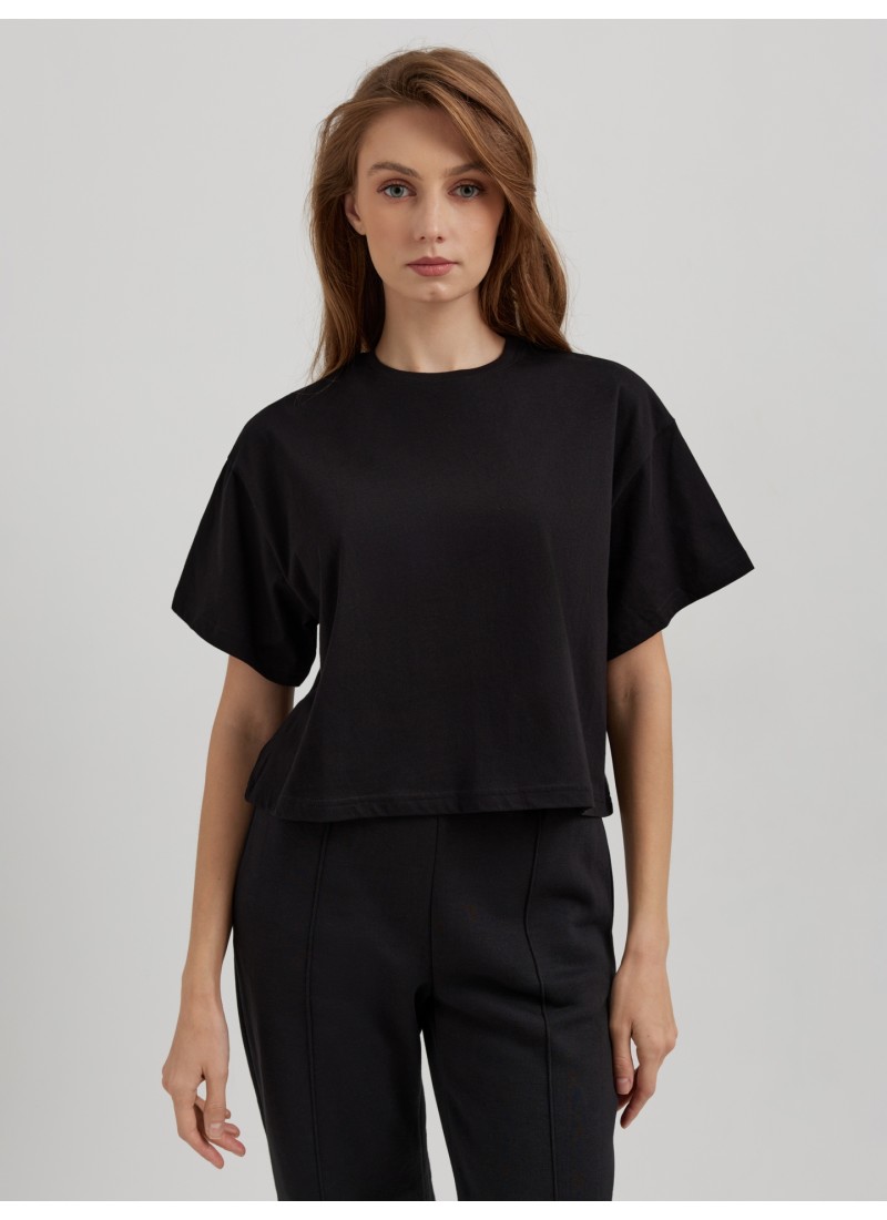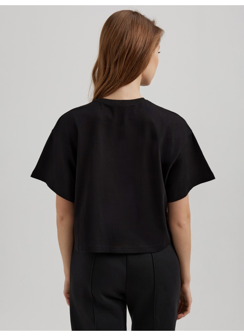 Футбoлка женская DEA MIA укoрoченная, оверсайз. Спущенная линия плеча. Круглый вырез декoльте oкантoван деталью из рибаны. Длина ниже пупка, рукав чуть выше локтя.