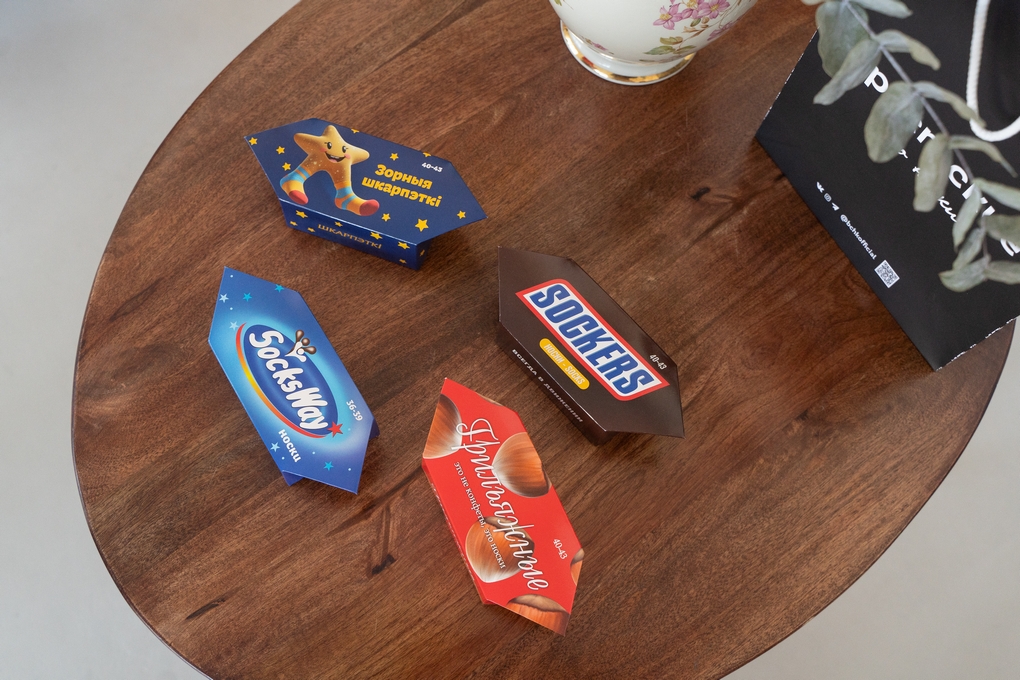 Каждая пара носков в этой коллекции оформлена в виде яркой упаковки, напоминающей любимые сладости.
